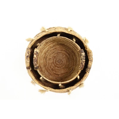 Solve your storage issues stylishly with this pair of naturally brown and beige, large round storage baskets, handmade with banana leaf wicker. Each eclectic wicker basket has beige wooden beads dropping beige tassels around the tapered top. The thick, coiled handles on the sides are made from sun-dried banana leaves, jutting out from the pot belly-shaped body, which displays tightly stacked wicker cords secured by clear line for a tight, coil weave design. The clear acrylic string creates a subtle starburst pattern on the interior base for a little extra hidden pop of style! These oval baskets nest together for easy (very cool looking) storage.