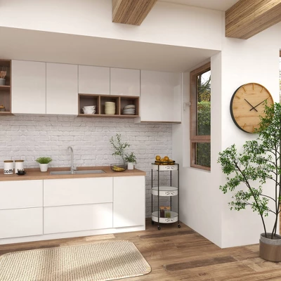- •This farmhouse-labeled rolling storage cart has three tiers of trays, no handles, and 4 wheels