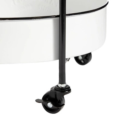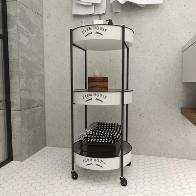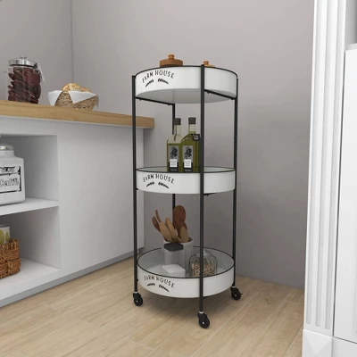 This 3-tier tray on wheels functions as a book cart, fruit basket, or utensil holder. Station it in the kitchen, dining area, bedroom, or library, or roll it to anywhere in the house. This item ships in 1 carton. Cart rolls on four wheels.. Suitable for indoor use only. Some assembly required. Maximum weight limit is 30 lbs. This is a single white colored rolling cart. Iron storage cart features 3 shelves. Farmhouse style. Showcases embossed “FARM HOUSE” typography on front of each tray.
