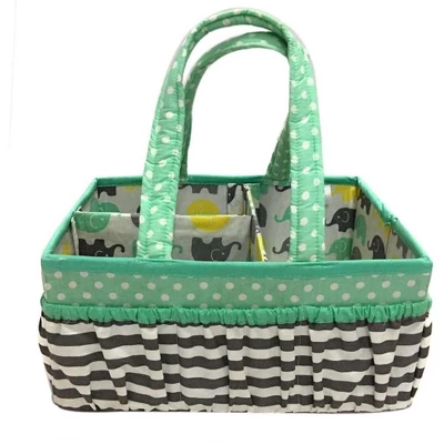 Add organization to any area of your home with the portable Nursery/Toddler Storage Caddy by Bacati. Perfect for dressers and changing stations, this lightly padded caddy has 8 outer pockets and a removable “T” separator for maximum versatility. The soft cotton percale fabric with stiffner inside keeps the shape intact, lining and handles feature a padded with polyfilled and cordinating trim. Keep diapers, wipes and other necessities tidy while traveling from room to room. Caddy also functions as an organizer for crafts, picnics, pet supplies, etc. Measures 12.5 in x 6.25 in x 8.5 in.