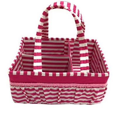Add organization to any area of your home with the portable Nursery/Toddler Storage Caddy by Bacati. Perfect for dressers and changing stations, this lightly padded caddy has 8 outer pockets and a removable “T” separator for maximum versatility. The soft cotton percale fabric with stiffner inside keeps the shape intact, lining and handles feature a padded with polyfilled and cordinating trim. Keep diapers, wipes and other necessities tidy while traveling from room to room. Caddy also functions as an organizer for crafts, picnics, pet supplies, etc. Measures 12.5 in x 6.25 in x 8.5 in.