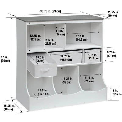 Badger Basket’s Combo Bin Storage Unit with Three Baskets is a sturdy solution for keeping all kinds of items organized and tidy. From crafts to toys, it will be a breeze to sort, clean up, and enjoy an orderly room. Features two open shelves, three baskets in two different sizes, and three cubby bins. A versatile unit for the nursery, children’s rooms, playrooms and game rooms, entryways and foyers, and family rooms. An ideal size for toddlers and young children learning to put things away. Top surface offers an additional place to stack books or display trophies. Baskets are removable. Easy to clean, solid panel, smooth surface construction. Made of engineered wood with melamine lamination. Baskets made with non-woven fabric and internal cardboard structure. Overall unit measures 36.75 inches L x 15.75 inches W at the bottom (11.75 inches deep at top) x 37 inches H. Shelf areas each: 17.5 inches W x 11 inches D x 12.75 inches H (height to lower edge of top trim is 11.5 inches). Small baskets: 8 inches Wide x 10 inches Deep x 6 inches High. Large basket: 16 inches Wide x 10 inches Deep x 6 inches High. Bottom bins – interior: 11.5 inches Wide x 15.25 inches High. Bottom bins – depth at bottom: 14.5 inches. Bottom bins – depth at top: 10.5 inches Deep. Height from floor to highest edge of front trim: 6 inches. From floor to basket shelf is 16.5 inches H. From floor to top open cubby shelves is 23.5 inches H. Assembled weight: 52.5 pounds. All measurements approximate. Wipe clean and dry thoroughly. Spot clean the baskets. Adult assembly required. Product may vary slightly from shown. Props/accessories shown are for illustration purposes only. Item ships in its original carton that may include a product photo. Product complies with all currently applicable safety standards. Actual color/finish may vary from screen display. Soft plastic/rubber toys (such as balls) can react with the finish when left in prolonged contact. Be mindful of what is stored in the unit.