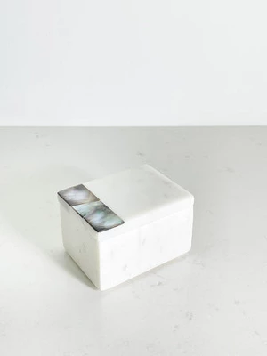 The Grey Mother of Pearl White Marble Decor Box is accented with Genuine Mother of Pearl with a natural Iridescent Grey color tone with hints of light golden accents. When light hits each piece, the iridescent colors shine bright against the White Marble background creating a luxurious, natural experience. Each piece is hand made; white gift box included.