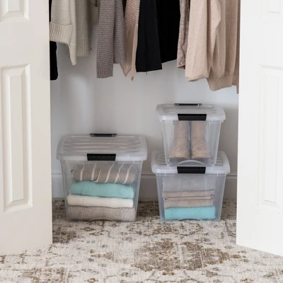 The stackable storage bin system built to meet your needs. These IRIS USA Stack & Pullâ„¢ storage boxes easily stores clothes, linens, shoes, and more. Sturdy buckle up latches keep the lid securely in place, and the built-in handle makes it easy to pull the box off of a shelf. Storing boxes stack neatly with other units in the Stack & Pullâ„¢ series. Set includes one 53 QT, one 32 QT, and one 19 QT Stack & Pullâ„¢.