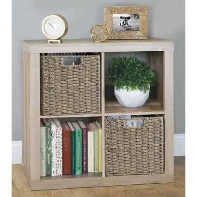 - Storage bins have integrated handles making them easy to pull on and off of shelves or cubbies