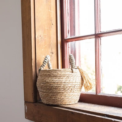 A beautiful hand-woven basket crafted from natural seagrass fibers, finished with corn husk wrapped handles and a raffia tassel. This basket offers a great option for stylish organization as well as being a great decorative accent. Add a small potted plant for a touch of greenery to your boho aesthetic.