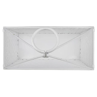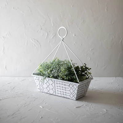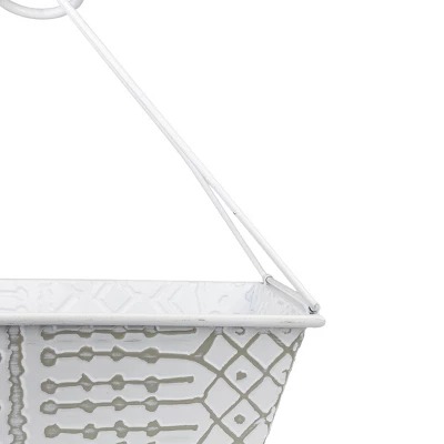 Foreside Home & Garden offers a boho inspired caddy that is perfect for storage or use as a hanging planter. Crafted from a matte white metal with gray-wash that accentuates the embossed geometric pattern. A simple yet modern design that is both durable and stylish.