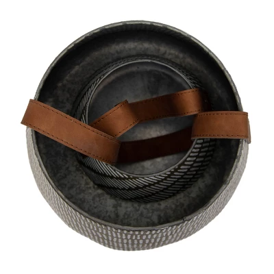 Organize your home in style with a set of two round baskets from Foreside Home & Garden. Made of a brass washed galvanized metal, featuring an embossed ticking pattern finished with a whitewash rub. The brass finish and faux leather handle gives the baskets a rustic vibe, modernized with an aesthetically pleasing textural pattern.
