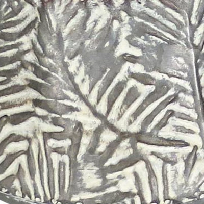 Unique in shape, design, and texture, the Foreside Set of Two White Washed Langford Baskets are sure to be a fun addition to your décor. The baskets are both metal with a white wash over the outside texture with the larger basket a leaf imprint and the smaller basket a multitude of shapes. Not the typical basket shape, the baskets are tapered, larger at the bottom getting smaller near the top. Topped with a faux leather strap to carry the basket, this piece will without a doubt be a new favorite in your household.