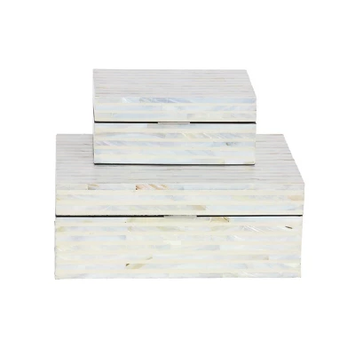 Perfect way to add depth and texture to your surface space with this compact and discreet box. A practical yet stylish upgrade that instantly elevate the look of your room. This coastal style wood storage box with lid will make a great jewelry box or a table centerpiece in your laidback home. Designed with felt or rubber stoppers at the base that prevent scratching furniture and table tops, as well as sliding around. This item ships in 1 carton. Mother of pearl box makes a great gift for any occasion. Due to the handmade nature of this item, no two will be alike, there will be slight differences in shape, size, and color. Suitable for indoor use only. This item ships fully assembled in one piece. Made in Vietnam. This white colored decorative keepsake box comes as a set of 2. Coastal style.