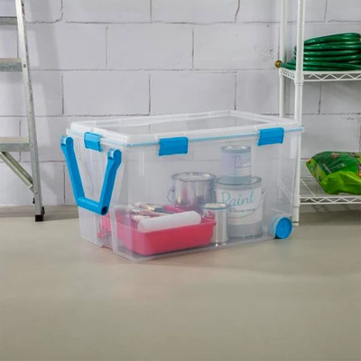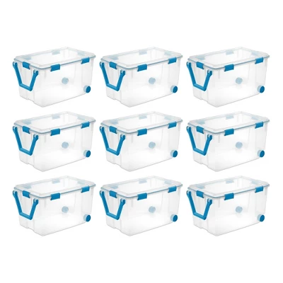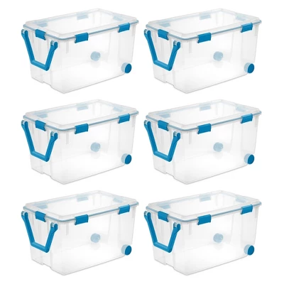 Need help organizing your crafting supplies, office supplies, small toys or creative projects, or keepsakes in a garage or basement? This 3-Pack of Sterilite 120-Quart Clear Plastic Wheeled Storage Container with Gasket Latched Lids will help you with your moving or storage needs.These durable storage totes feature a 120-quart capacity and are an ideal solution for keepsakes, photographs, important documents, linens, clothing, and other items that need to be stored away and protected. The 2 rear wheels and large, rotating pull handle make for easy transport.The gasket seals air and moisture, keeping your special belongings safe from the elements, dust, and bugs. Durable, tight-fitting latches keep the lid secured to the base, and the clear lid and base allow contents to be easily identified without opening the lid.Enjoy the peace of mind organization can bring to your home with the set of (3) 120-quart clear plastic wheeled storage containers with gasket latched lids from Sterilite.