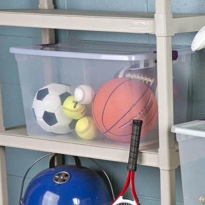Clear some clutter out of your life and tuck away stuff big and small with the help of this handy pack of Sterilite 66-Quart Nesting Clear Latching Storage Totes.These plastic storage containers feature ergonomic latches that attach the lid securely to the base and are easy to unlatch. The see-through base and lid allow contents to be easily identified from any angle, even when these totes are in storage. Thanks to the indexed lids, you can also nest these plastic storage bins, one on top of the other. This storage box is ideal for storing blankets and other bulky items around the home. These Sterilite boxes feature contemporary styling with ergonomic, color coordinated latches.Take a little confusion and frustration out of storage and get organized today with these Sterilite 66-Quart Nesting Clear Latching Storage Totes.