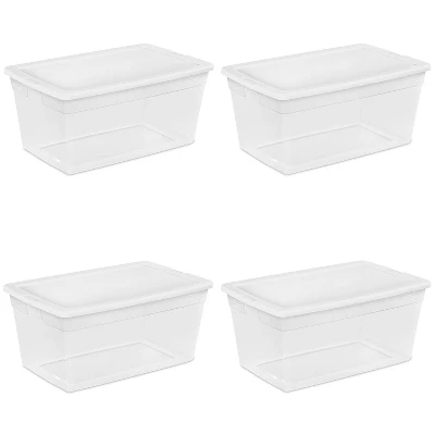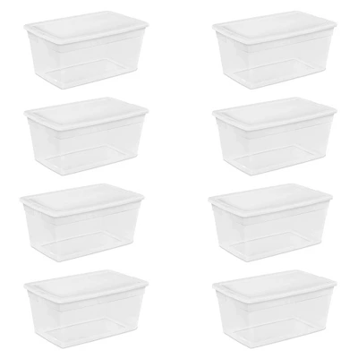Store away the large items that are lying around the house or declutter your office space with the Sterilite 90-Quart Storage Box Containers. There are 8 totes included in this package that are ideal for storing blankets, seasonal decor, clothing items, and other personal equipment. With a 90-quart capacity, these durably made containers can be used for multiple things season after season. Equipped with a secure lid that snaps to the base of each tote, your valuables are ensured to remain safe and undamaged. The clear, transparent design of each box makes it easy to see exactly what you need at a glance. With the recessed lids, you are able to stack multiple boxes on top of one another to maximize space and create your ultimate storage solutions. Store away seasonal items like beach towels or winter sweaters and swap boxes when the time is right. Enjoy tidying up your home and office spaces with the Storage Box Containers from Sterilite.