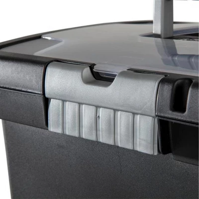 Sterilite Portable Lockable File Box W/ Extra Compartment, Built-In Handle & Titanium Gray Latches, Black Base & Clear Lid (4 Pack)