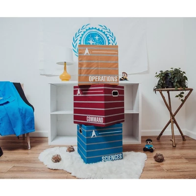 - FUN STORAGE SOLUTION: Set of 3 collapsible storage cubes with metal handles in Division-Colors: Command-Red, Operations-Gold, and Sciences-Blue.
